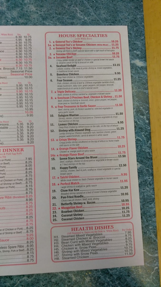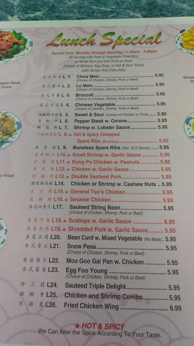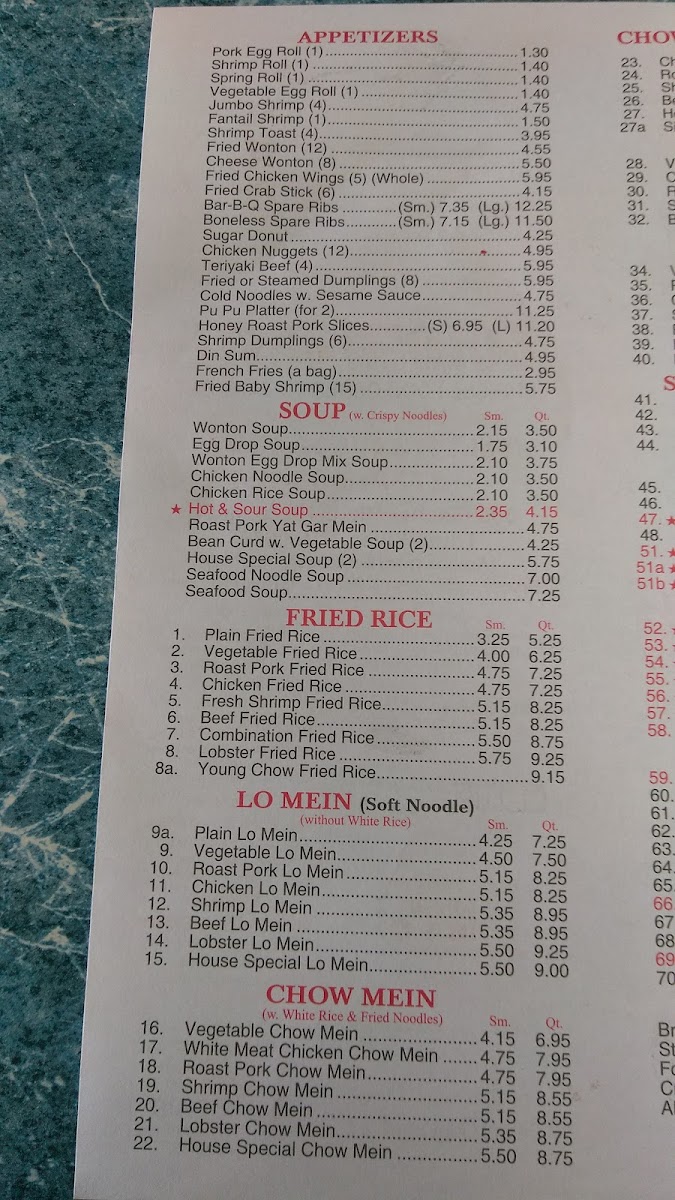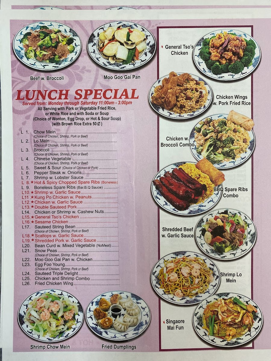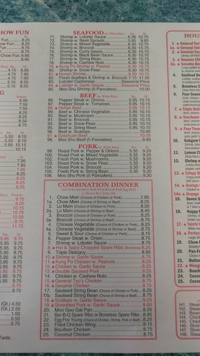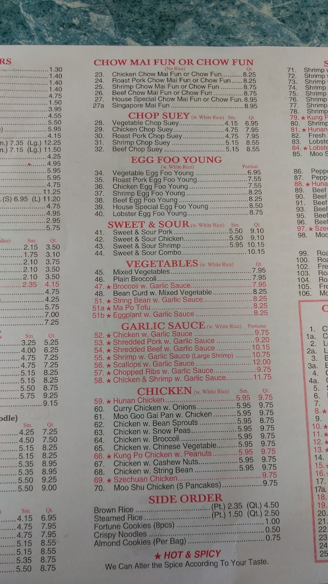 For seafood enthusiasts, choices like Shrimp with Lobster Sauce and Shrimp with Broccoli offer a delicious taste of the sea. The restaurant also excels in noodle and chop suey dishes, such as Roast Pork Lo Mein and Chicken Chow Mein.